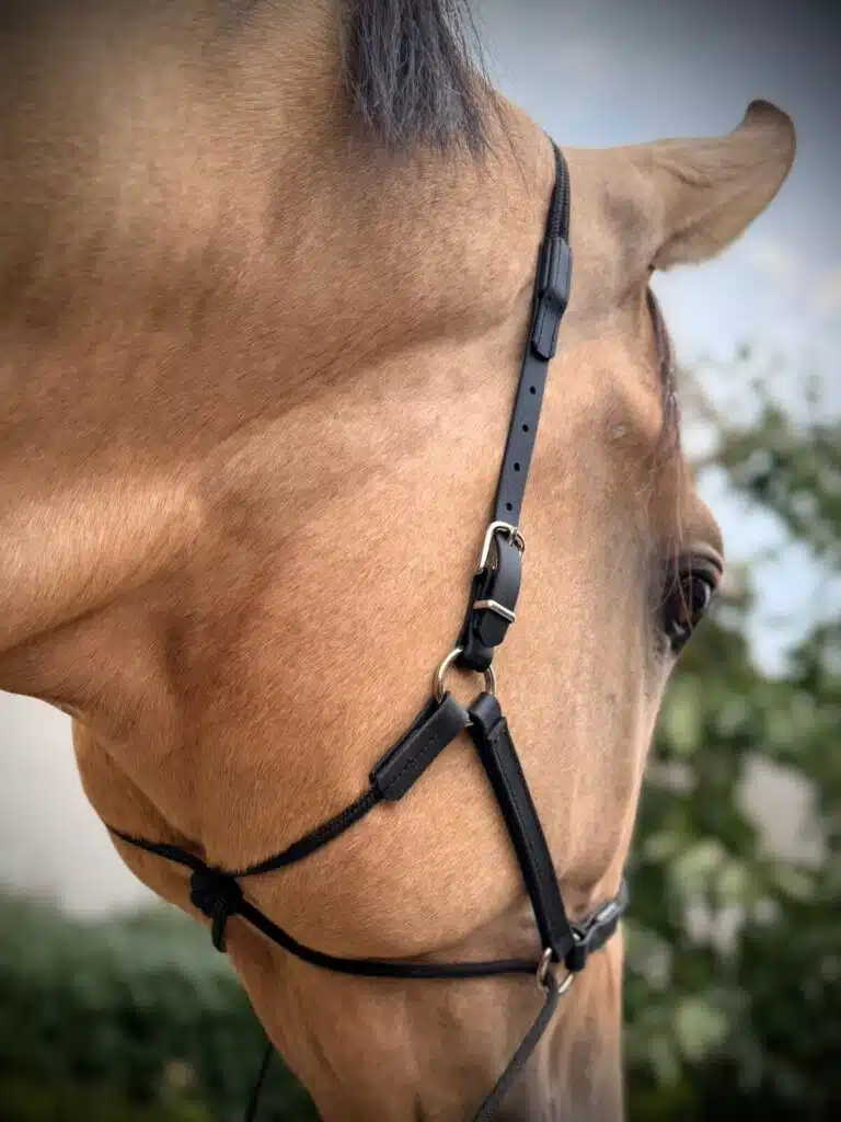 Die Bitless-Bridle-Riemen werden in die D-Ringe am Backenstück eingehängt, unter dem Pferdekopf gekreuzt und durch die Sidepullringe gefädelt. In die Schlaufe am Ende der Riemen schnallst du deine Zügel ein. So kannst du ohne Hebelwirkung über verschiedene Druckpunkte einwirken.