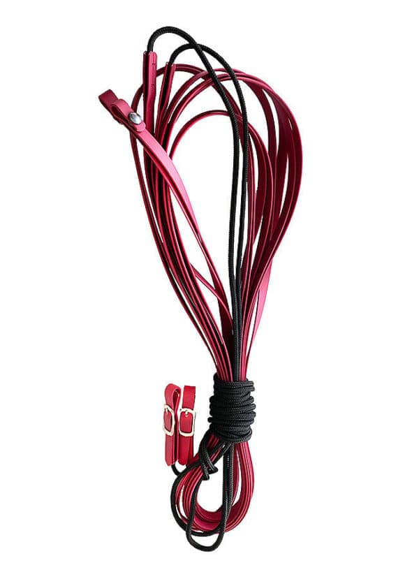 Bei einer Gesamtlänge von 14m, 16m oder 18m ist die Doppellonge unglaubliche 700g leicht! Sie besteht pro Seite aus 2,50m stabilem PPM Seil, das nicht nahtlos, sondern sauber und stabil vernäht in 6,50m Biothane übergeht. Das runde Seil gewährleistet optimales Gleiten durch die Ringe des Longiergurtes und ermöglicht schnelle Nachgiebigkeit der Hand.