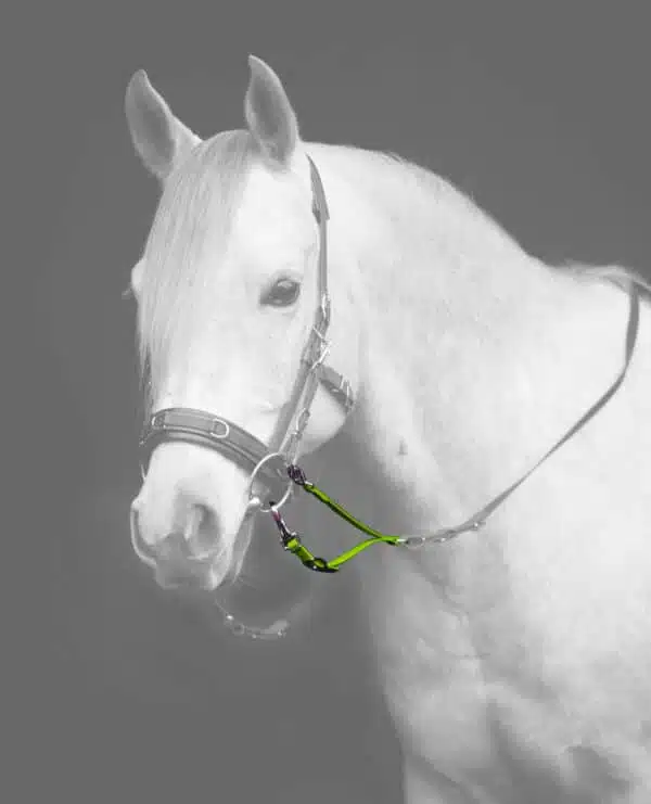 Klicke den kleinen Karabiner der Weiche in den Sidepullring und den großen Karabiner (Snap) in den Gebissring. Der Riemen, der zum Gebiss führt, ist längenverstellbar, so dass du nun einstellen und entscheiden kannst: soll auf Nase und Maul gleichermaßen eingewirkt werden oder auf die eine oder andere Art stärker?